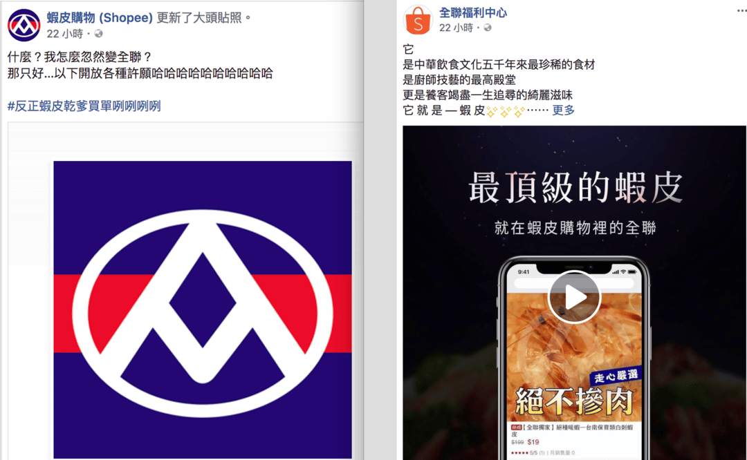 蝦皮購物,新加坡SEA集團旗下的一個拍賣與購物商城平台,一開始是以「蝦皮拍賣」進軍台灣市場 ,2017年8月,蝦皮拍賣正式升級為「蝦皮購物」全方位購物平台。2018年3月,蝦皮購物正式推出「蝦皮 24h」購物中心,宣告進軍 B2C 市場,提供24小時快速到貨,成為台灣第一個整合B2C購物、B2B2C商城、C2C拍賣的一站式綜合電商。 非常值得關注的是他的臉書粉絲團人數目前約有950萬人按讚,佔了台灣人口數的40%,等於每十個人之中,就有四個人拜訪過蝦皮購物的臉書粉絲專頁!在今年4月1日,蝦皮購物發表了一系列令人會心一笑的七張照片,簡單明瞭的照片配上黃色幽默的文字,吸引了2.7萬人按讚,5千多人留言和分享。