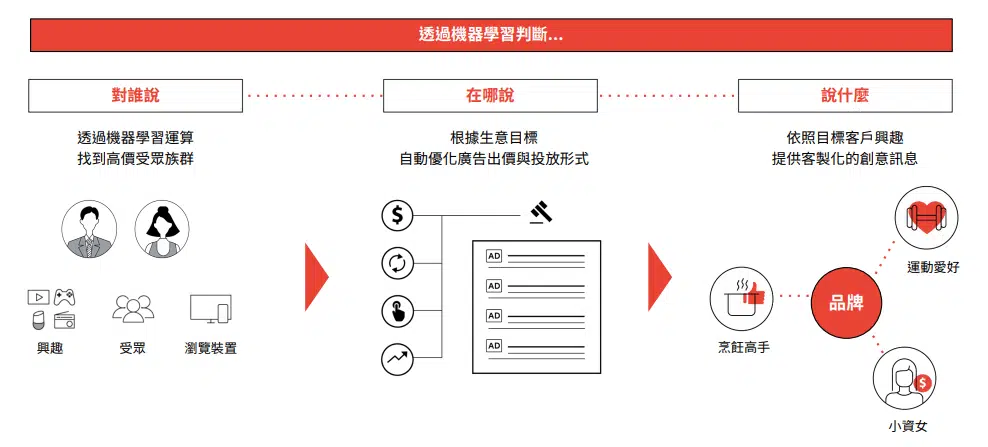 第三個策略則是要在混沌的消費者旅程中,運⽤機器學習 (Machine Learning) 讓每⼀次的成本投入效益極⼤化,在對的時間、對的平台,找到對的受眾並提供對的產品。