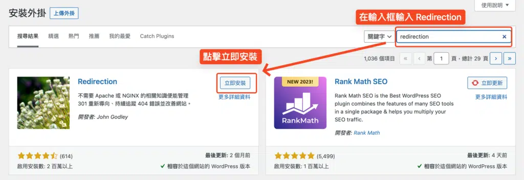 Toggle前往 WordPress 管理後台的「外掛 > 安裝外掛」中搜尋「Redirection」並點擊「立即安裝」,待安裝完後點選「啟用」。請注意你必須要擁有安裝外掛的權限才能進行,如果你沒有相關的權限,請聯繫你的網站廠商或是主機代管廠商協助。